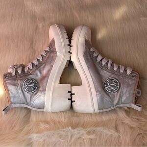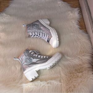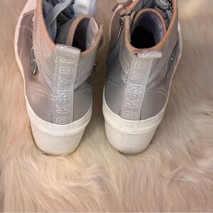 Elevate your footwear collection with these Dkny lace-up boots, featuring a striking silver hue and a cozy textured pattern. The high-top design offers both style and support, while the thick white soles ensure comfort and durability. Perfect for adding a touch of elegance to your winter wardrobe.