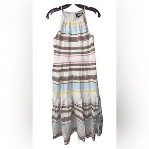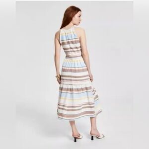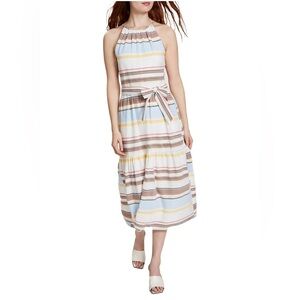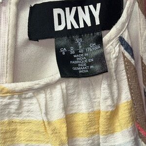 Embrace effortless style with this DKNY sundress, featuring a chic tie front and a halter neckline. Crafted in a breezy white fabric, this sleeveless midi dress is perfect for casual outings or resort wear. Its elegant design and comfortable fit make it a versatile addition to your wardrobe.