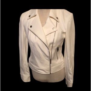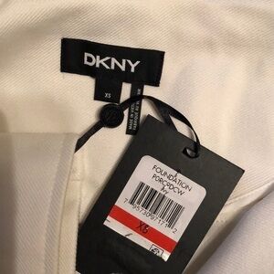 Dkny in white. Details are asymmetrical front zipper, metal snaps, side zipper pockets, cuffs with zippers. Faux lower side belt feature. Xs. Poly/rayon fabric NWT