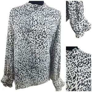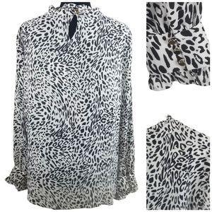 Details: long sleeve, ruffle neck/ cuffs, 3 button cuffs, 2 button closure in back, animal print, 100% polyester,