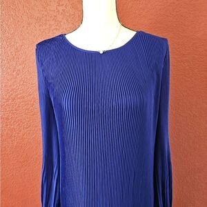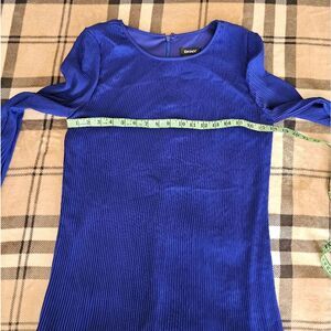 This elegant knee-length sheath dress by Dkny showcases a rich royal blue color and features long bishop sleeves that add a touch of sophistication. The crew neck design complements the soft flowing fabric, making it a perfect choice for wedding guest occasions.