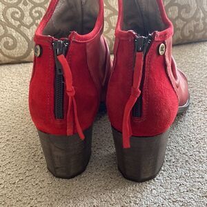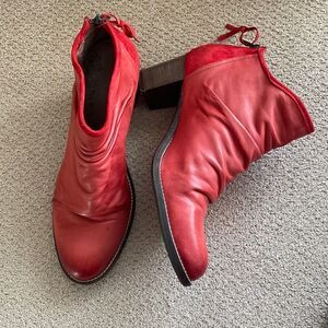 Gorgeous Dkode red leather and suede ankle boots with ruched details at vamp. Perfect for any occasion.