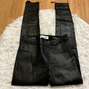 In excellent used condition no rips, tears or stains. Coated crinkle denim in a faux leather style, elastic waistband, frayed raw hem, high waisted high rise, faux back welt pockets and hidden side zipper closure.