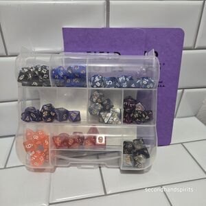 This striking set of polyhedral dice is perfect for Dungeons & Dragons and other tabletop RPG adventures. Housed in a clear, compartmentalized storage box, this collection features a range of vivid, uniquely styled diceincluding shimmering blues, deep blacks, and fiery redsready for battle or display.
