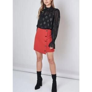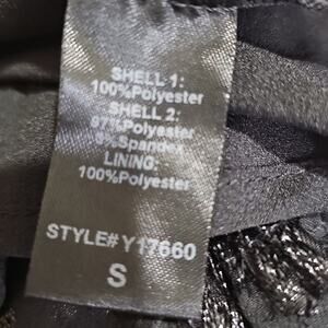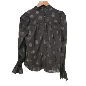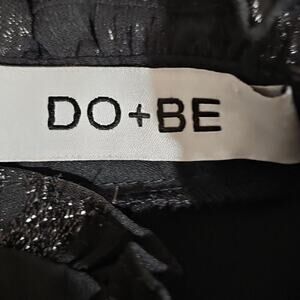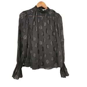 Do + Be Mock Neck Woven Blouse in Black. Size S / Small. Features mock neck, long sleeves with elasticized cuffs, jacquard detailing, back keyhole with button closure, and sheer fabric. Style Y17660. Shell 1: 100% Polyester. Shell 2: 97% Polyester, 3% Spandex. Lining: 100% Polyester. Excellent pre-owned condition, no flaws.