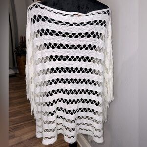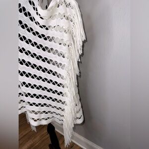 Stay cozy and stylish with this poncho fringed overlay. Perfect for layering and adding a touch of sophistication to any outfit. Has gold fibers mixed in the cream yarn. 100% acrylic.