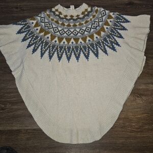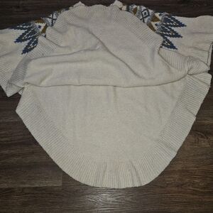 This women's sweater poncho by Do Everything in Love features a Fair Isle pattern with tinsel accents, giving it a festive and colorful Aztec-inspired design. The oversized pullover style has a round neckline and is made of a blend of polyester, acrylic, and elastane in ivory color. Perfect for casual occasions in winter or fall, this one-size garment should be hand washed to maintain its quality. The sweater poncho embodies a Western, bohemian, and holiday-themed aesthetic, making it a stylish choice for outdoor gatherings or Christmas festivities.