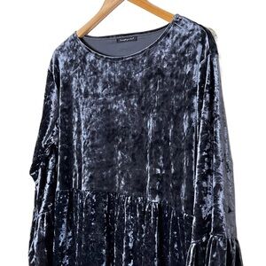 Lush, tiered one-size velour mini dress (or tunic) with long sleeves ending in a cute bell silhouette. Pullover styling. Dark blue/gray. Pristine condition.