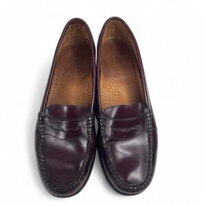 The G.H. Bass & Co Weejuns Wayfarer Women's Burgundy Leather Penny Loafer Shoes are a stylish and comfortable option for women in size 9. These slip-on loafers feature a round toe, low block heel, and solid red color, perfect for casual occasions in all seasons. Made with leather upper and lining, these shoes are cushioned for added comfort, making them ideal for walking and everyday wear. With a classic preppy style and timeless design, these G.H. Bass & Co. loafers are a versatile addition to any wardrobe.