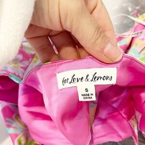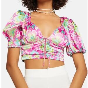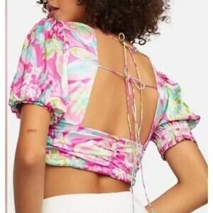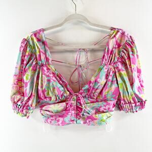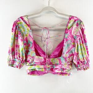 v neckline, tie front, open tie back, cropped, floral, puff short sleeves, floral print, pink