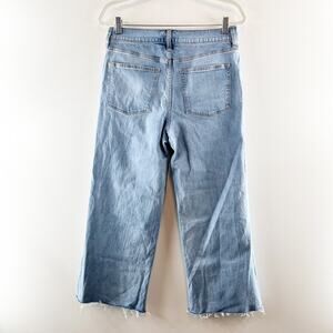 high waisted, light wash, raw frayed hem, denim, jeans, wide leg, cropped fit