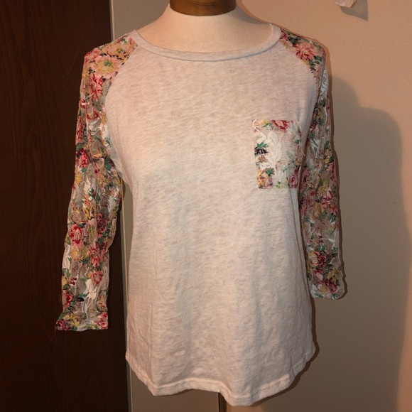 Tan Top with Lacy flowered 3/4 sleeves
