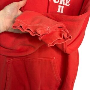 Used condition. Some cracking to front letters, bleach stains on hood strings and some wash wear.