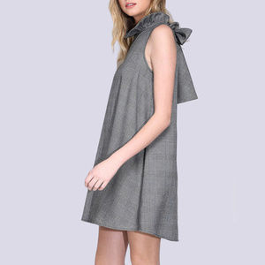 Gray checkered high neck ruffle collar shift/swing dress (Blythe Dress) with back tie bow styled in classic and timeless A-line cut. Fabricated in flannel/twill fabric (65% Polyester 35% Cotton blend) which has a good drape. Unlined but not sheer. Hidden zipper closure on back. Work appropriate paired with closed toe heels with a cardi or blazer and versatile for a night out paired with strappy stilettos. Hand wash for better care. Imported.