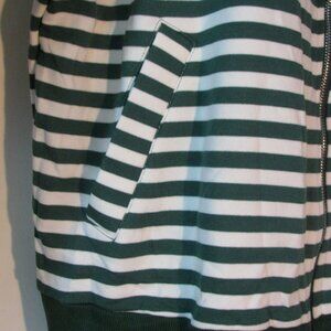 DoKoToo jacket in plus size 2XL. New with tags, this jacket has a full zip up front and long sleeves. Green and white stripes, green solid trim. Super nice quality and style, you will need this come fall. Made from 75% cotton and 25% polyester, machine wash.