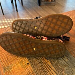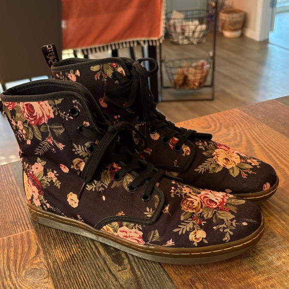 Chic floral design on black canvas. Lace-up style. Durable sole.