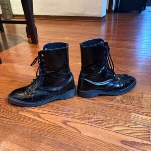 Very rare! Dr. Marten's Langston boots in Petrol Oil Slick color. It was a bit dark today so going to get some lighter photos to show the irridescence. Close-up you will see a tiny cut/puncture on one and some small cracking at the toe crease. IRL hard to tell, but see a lot when zooming in in the light. Clearly, a leather wipe will leave residue/fragments when you wipe them down :) Lesson learned LOL.