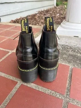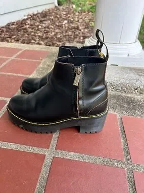 Classic black leather ankle boots with chunky platform sole. Side zipper for easy wear. Contrasting yellow stitching for classic Dr Marten look.