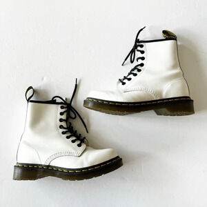 Dr Martens white leather boots perfect for the holiday season. Eight eye lace up style. 7” shaft height. Women’s size 6 or 37 EU. Preowned, very light wear with very light to minimal scuffing to the white leather; see photos.