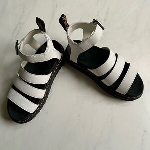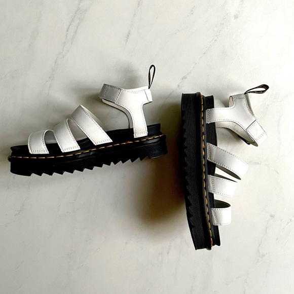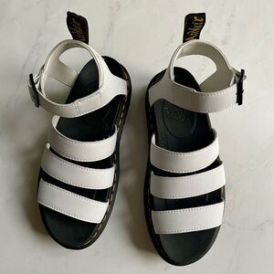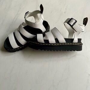 Doc Martens White Leather Platform Blaire Sandal Tagged a Size Woman’s 6, but these run BIG. Recommend for a size 7-7.5 (see size chart in last photo). Worn only once! - Adjustable ankle straps - Slight wedge - Light weight and comfortable