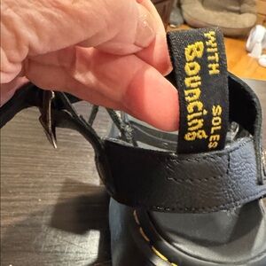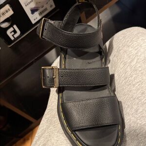 These are Dr. Martens Gryphon platform sandals in black, featuring a thick sole and adjustable straps.