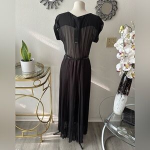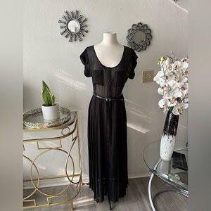 Chic black sheer maxi dress with a stylish belt. Perfect for any occasion.