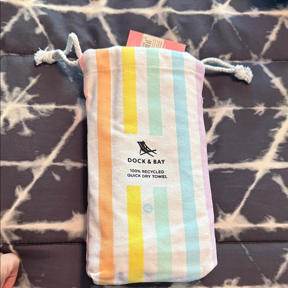 Experience the softness of the Dock & Bay Striped Quick Dry Towel. Featuring pastel multicolor stripes, this towel is perfect for beach adventures. Made from 100% recycled materials, it's eco-friendly and stylish.