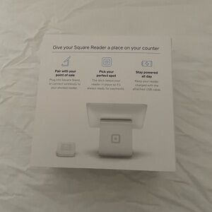 This dock for a Square Reader typically serves as a charging station and a secure place to hold the Square Reader when not in use. It's designed to keep the Square Reader upright and easily accessible for transactions, while also ensuring it remains charged throughout the day. Docks often feature a sleek design that complements the Square Reader itself, making them suitable for retail counters, cafes, and other business environments.