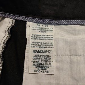 Pre-Owned Docker Classic Fit Black Men's Pleated Pants. 38" x 30" 74% Cotton, 24% Polyester, 2% Elastane. Shows slight wear. No defects. Photos are of actual item, please look carefully.