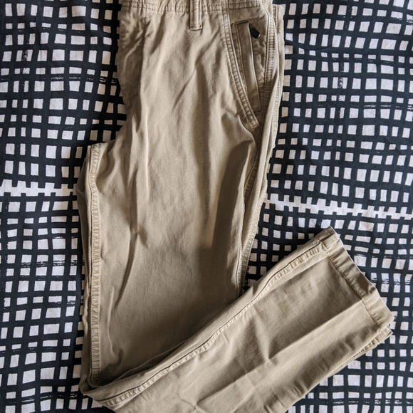 Brown Kakis more on the darker side, has a nice pocket with zipper on left side and they are stretchy Kakis.