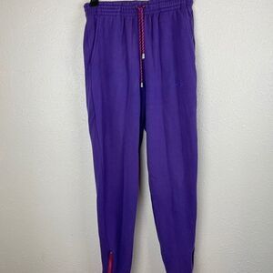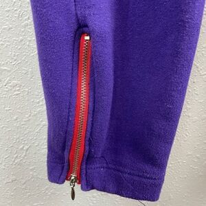 Fun pair of purple docker sweatpants featuring a red drawstring and red lined zipper at the ankles. They measure 13 inches at the waist with extra stretch in the elastic waist. The inseam is 30 inches. They are in good lightly used preowned condition.
