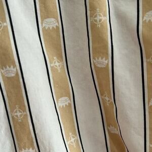 Dockers long sleeve button down blouse shirt with pointed collar, breast pocket and long sleeves. The blouse is a beautiful camel white and navy blue striped pattern with crowns and Weathervain symbols in the stripes, it is 100% cotton.