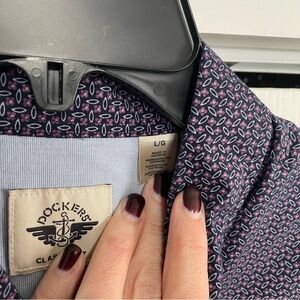This is a man's Dockers Classic Fit button down shirt with a collar. The shirt has a pocket on the front with the Dockers logo. Shirt is a size large and is a cotton and polyester blend. Shirt is a deep navy with purple accents and is super pretty!