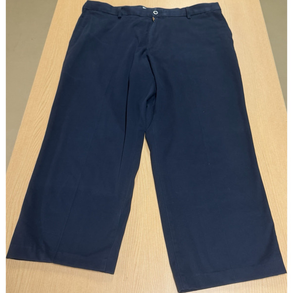 These Dockers Dress Pants in navy blue are a versatile option for men's casual and office wear. With a relaxed fit and stretch feature, they offer comfort and ease of movement. No stains or rips on fabric. Zipper in working condition. Button back pockets.