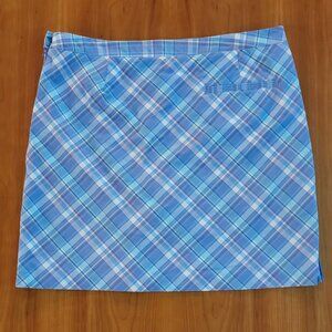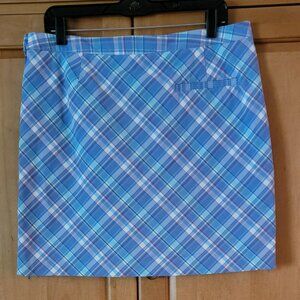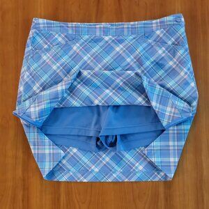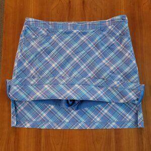 Purple, blue, pink and white plaid Dockers Golf athletic skort. It features two front slash pockets, one back pocket and coordinating periwinkle shorts underneath.