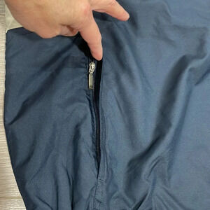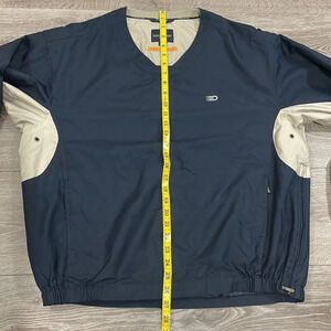 Dockers Golf Stain Defender V-Neck Pullover Windbreaker Jacket in size M. Excellent like new condition. Navy with light tan, two front zipper pockets, one side zipper vent, mesh lining and vented shoulders. Please see photos for approximate measurements and details. Item may show a difference in color based upon photography and perception. Photos are part of the description, as everyone’s level of condition may vary. From smoke free and pet free home. All packages are shipped the same or next business day.