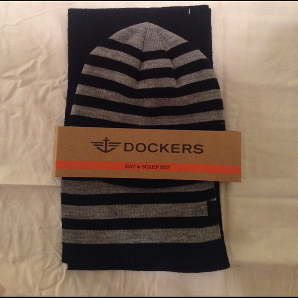 Dockers striped hat and solid-with-stripe scarf set. Never worn, original packaging. 100% acrylic. One size. Smoke-free home.