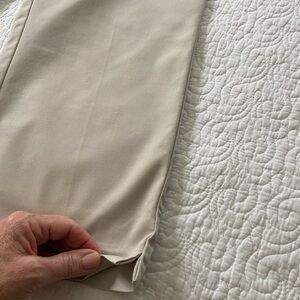 Dockers khaki pants in beige are ideal for versatile styling. With a wide straight leg and cropped length, they are perfect for casual occasions or the office. Small flaw in the back stitching. Maybe a diy repair. See last photo.