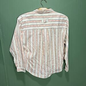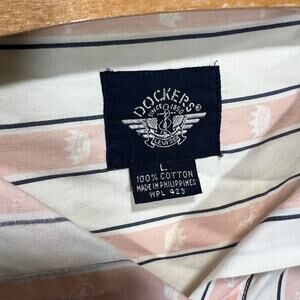 Elevate your wardrobe with this sophisticated Dockers striped button-down shirt in size Large. Crafted from 100% premium cotton for all-day comfort and breathability, this classic piece features a timeless white base with elegant blush pink and navy stripes. The subtle nautical compass motifs woven throughout add a refined touch that sets this apart from ordinary dress shirts. Perfect for business casual, weekend outings, or layering under sweaters. The quality construction includes a classic collar, full button front, and clean finished seams. This versatile shirt pairs effortlessly with chinos, jeans, or dress pants. The cotton fabric gets softer with each wash while maintaining its crisp appearance. Excellent pre-owned condition with no stains, tears, or significant wear. Ready to become your new go-to shirt for any occasion where you want to look polished yet approachable.