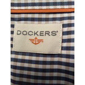 • Dockers Men's Blue White Tan Casual Button Down Shirt Mini Checkered Pattern Left Breast Pocket Dockers Logo on Pocket Measurement Lying Flat Pit 2 Pit 26 in Shoulder 2 Hem 30 in RN 15610
