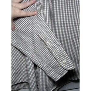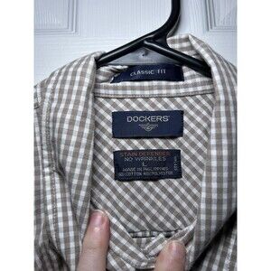 The Dockers Mens Classic Fit Stain Defender Long Sleeve Button Down shirt in size Large features a stylish plaid pattern in beige color, made from a blend of polyester and cotton for durability and comfort. This versatile shirt is suitable for various occasions including travel, weddings, parties, casual outings, formal events, work, and business meetings. The classic fit and collared neckline with button-down style offer a timeless and professional look, while the stain defender technology ensures easy care with machine washability. With accents like buttons and pockets, this all-season shirt is a practical and stylish addition to any man's wardrobe.