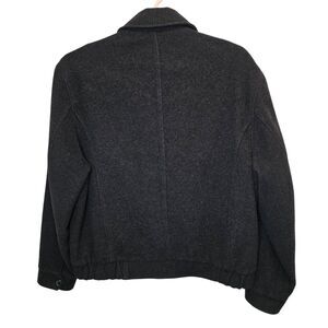 Dockers Men's L Charcoal Black Wool Blend Full Zip Bomber Coat Jacket. Front full zip closure. Interior left zip pocket. Interior right velcro pocket. 2 exterior open pockets. Button detail on cuffs. 80% wool, 20% nylon. Color is a dark charcoal black. See photos as it looks darker from afar and lighter when you are close up.