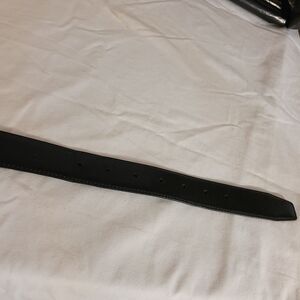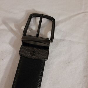 The Dockers Mens Reversible Belt in size 38-40 features a stylish black and brown faux leather design with a silver buckle accent. This versatile belt is perfect for both work and dress, with a solid pattern and bronze hardware. Made in Taiwan, it includes adjustable features and is reversible, offering two different color options in one sleek accessory. Elevate your style with this classic and outdoor-inspired belt from a trusted brand like DOCKERS. very nice buckle it looks like brass painted over with with black super shinny. Nice logo placement