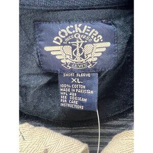 This Dockers polo shirt features a classic striped design and is made from 100% cotton for comfort and breathability. The short sleeves and relaxed fit make it ideal for casual settings. With its new-with-tags condition, this shirt combines style and practicality effectively, making it a timeless wardrobe addition.