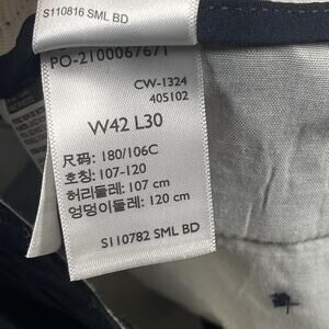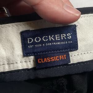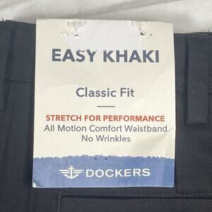 Men's Dockers Classic Fit Easy Khaki Pants in size 42x30 (measure 42x29 with a 12.5" rise). Timeless black khakis designed with Dockers' All Motion Comfort Waistband for extra flexibility and comfort. Made from a durable and comfortable blend of 64% cotton, 34% polyester, and 2% elastane. Features a wrinkle-free finish for easy care and a polished look. Classic fit provides a relaxed feel through the seat and thigh with a straight leg. New with tags. Perfect for work, business casual, travel, or everyday wear.