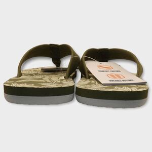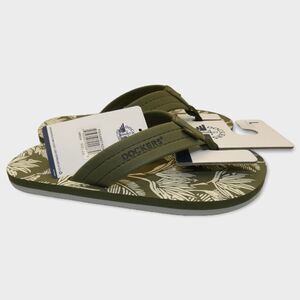 Premium kids flip flop sandals from Docker's feature a lightweight comfort footbed and durable EVA outsole. Designed in green with a cream palm print throughout the footbed with solid green toe post. Perfect for vacation, summer, or beach.