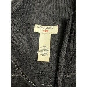 Dockers 1/4 zip long sleeve sweater. Men's size Large. Black, gray striped sweater made of 100% acrylic. No holes or stains. Pre-owned condition. Measurements in photos. Smoke free home.