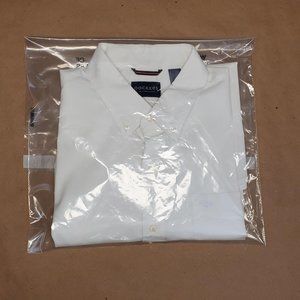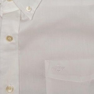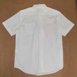 This button down short sleeve dress shirt features a classic fit making it perfect as a workday staple. This shirt features a comfort flex collar and a spade pocket with an embroidered logo. See photo for measurements.