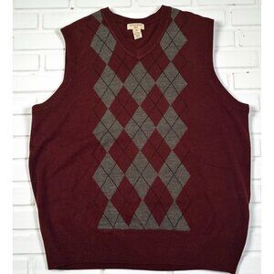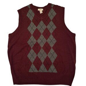 Classic Dockers men’s argyle sweater vest in a rich burgundy and gray color palette. Features a timeless diamond knit pattern on the front and a clean, solid back. This sleeveless pullover style is perfect for layering over dress shirts, polos, or turtlenecks — ideal for a preppy, business casual, or dark academia look.