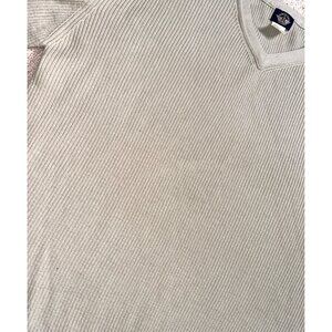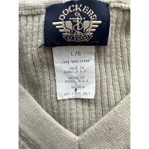 Dockers Wool Cream Ribbed V Neck Sweater offers vintage charm and unmatched comfort. Made from 100% wool, its cashmere cream taupe color adds timeless elegance. Size Large.